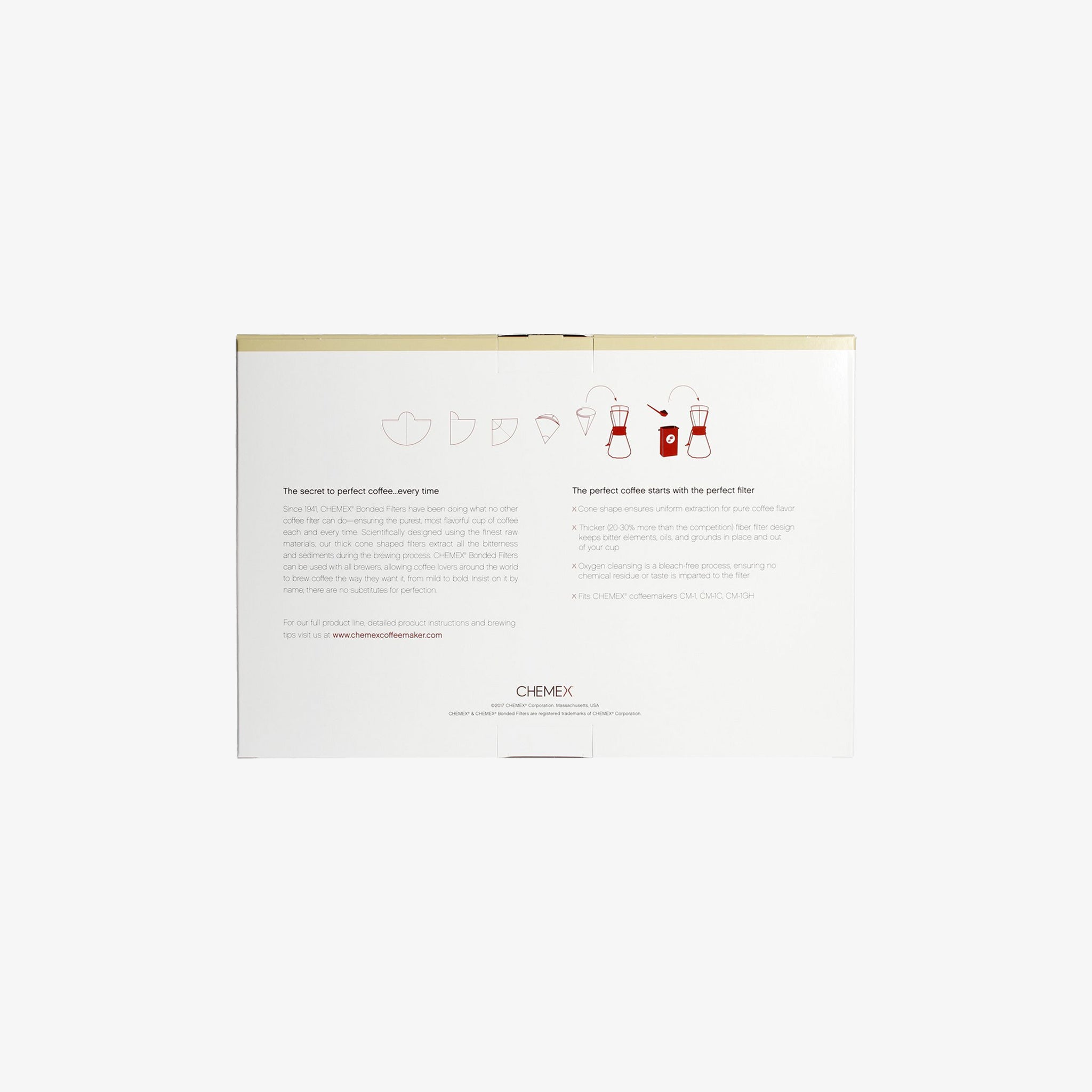 Brązowe, papierowe filtry do zaparzacza Chemex – komplet 100 sztuk. Filtry niezłożone, przeznaczone do samodzielnego zagięcia w kształt stożka. Ich półksiężycowata forma zapewnia precyzyjną ekstrakcję i doskonałą filtrację dzięki grubym ściankom.