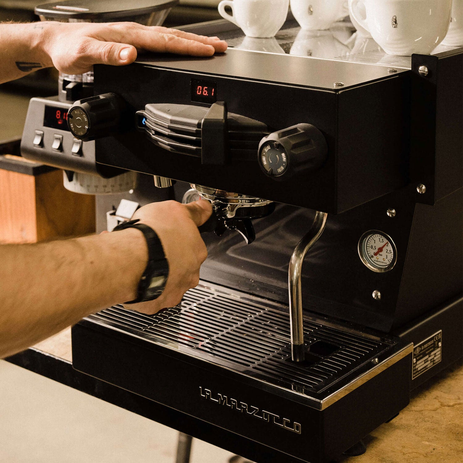 Ręczny interfejs dźwigni z elektroniczną preinfuzją, inspirowany maszynami La Marzocco z lat 70.